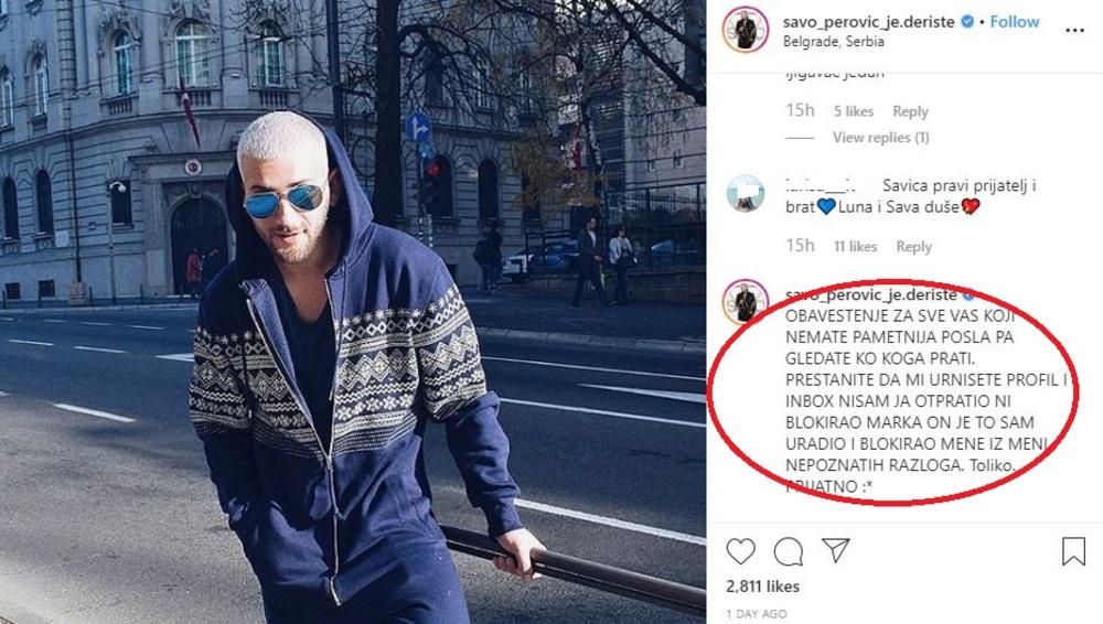 Tako danima, Markovi fanovi proganjaju Luninog prijatelja Sava Perovića, i to nakon što je Miljković njega otpratio na Instagramu.