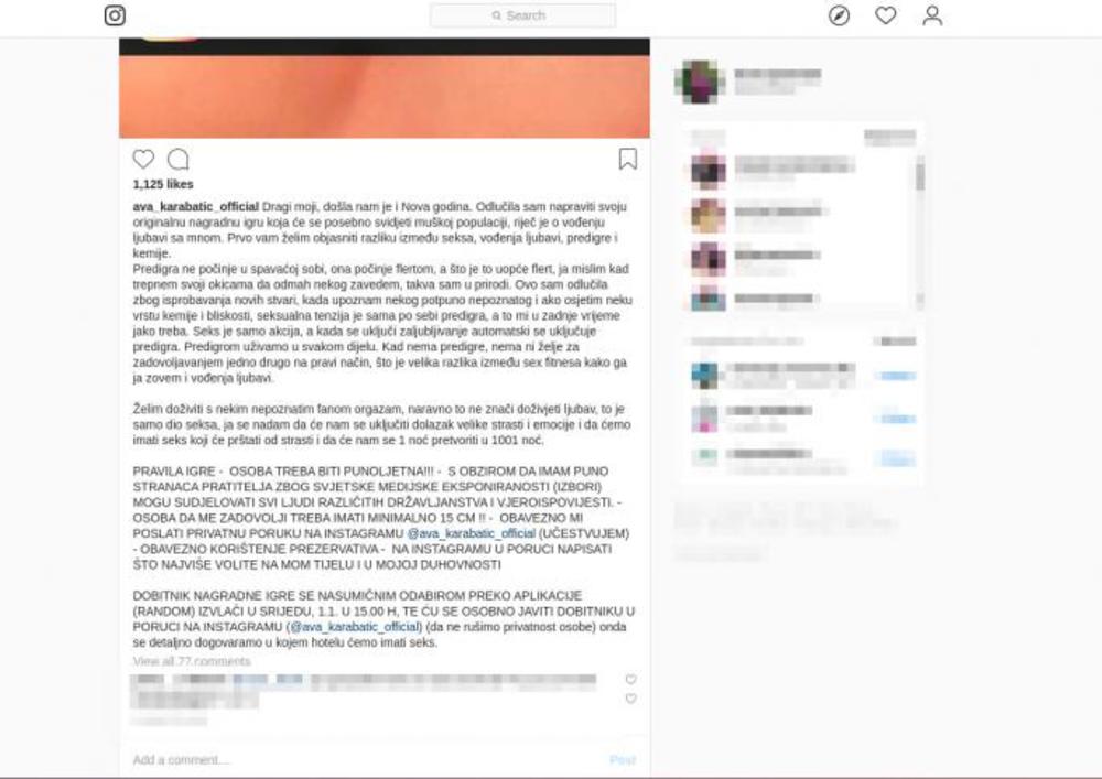 Dobitnik nagradne igre se nasumičnim odabirom preko aplikacije (radnom) izvlači u srijedu, 1.1. U 15.00 h, te ću se osobno javiti dobitniku u poruci na Instagramu (@ava_karabatic_official) (da ne rušimo privatnost osobe) onda se detaljno dogovaramo u kojem hotelu ćemo imati s*ks. - piše Ava na svom Instagram profilu.
