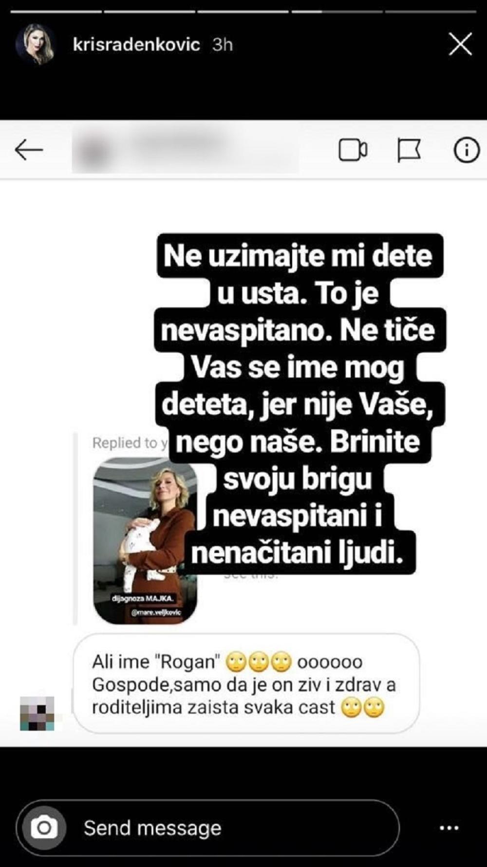 - Ne uzimajte mi dete u usta. To je nevaspitano. Ne tiče vas se ime mog deteta jer nije vaše, nego naše. Brinite svoju brigu nevaspitani i nenačitani ljudi - napisala je voditeljka, a zatim dodala: