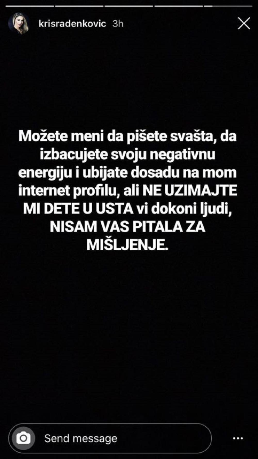 - Možete meni da pišete svašta, da izbacujete svoju negativnu energiju i ubijate dosadu na mom internet profilu, ali ne uzimajte mi dete u usta vi dokoni ljudi, nisam vas pitala za mišljenje.