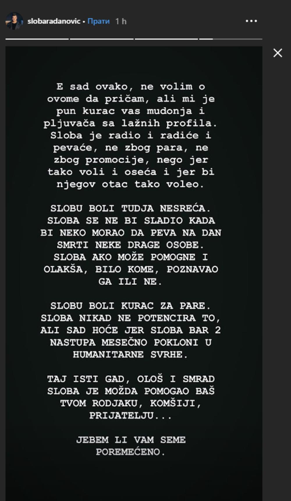 "E sad ovako, ne volim o ovome da pričam, ali mi je pun kur*c vas mu*onja i pljuvača sa lažnih profila. Sloba je radio i radiće i pevaće, ne zbog para, ne zbog promocije, nego jer tako voli i oseća i jer bi njegov otac tako voleo. Slobu boli tuđa nesreća. Sloba se ne bi sladio kada bi neko morao da peva na dan smrti neke drage osobe. Sloba, ako može da pomogne i olakša bilo kome, poznavao ga ili ne. Slobu boli kur*ac za pare. Sloba nikad ne potencira to, ali sad hoće, jer Sloba bar dva nastupa mesečno pokloni u humanitarne svrhe. Taj isti gad, ološ i smrad Sloba je možda pomogao baš tvom rođaku, komšiji, prijatelju. Je*em li vam seme poremećeno", napisao je pevač.
