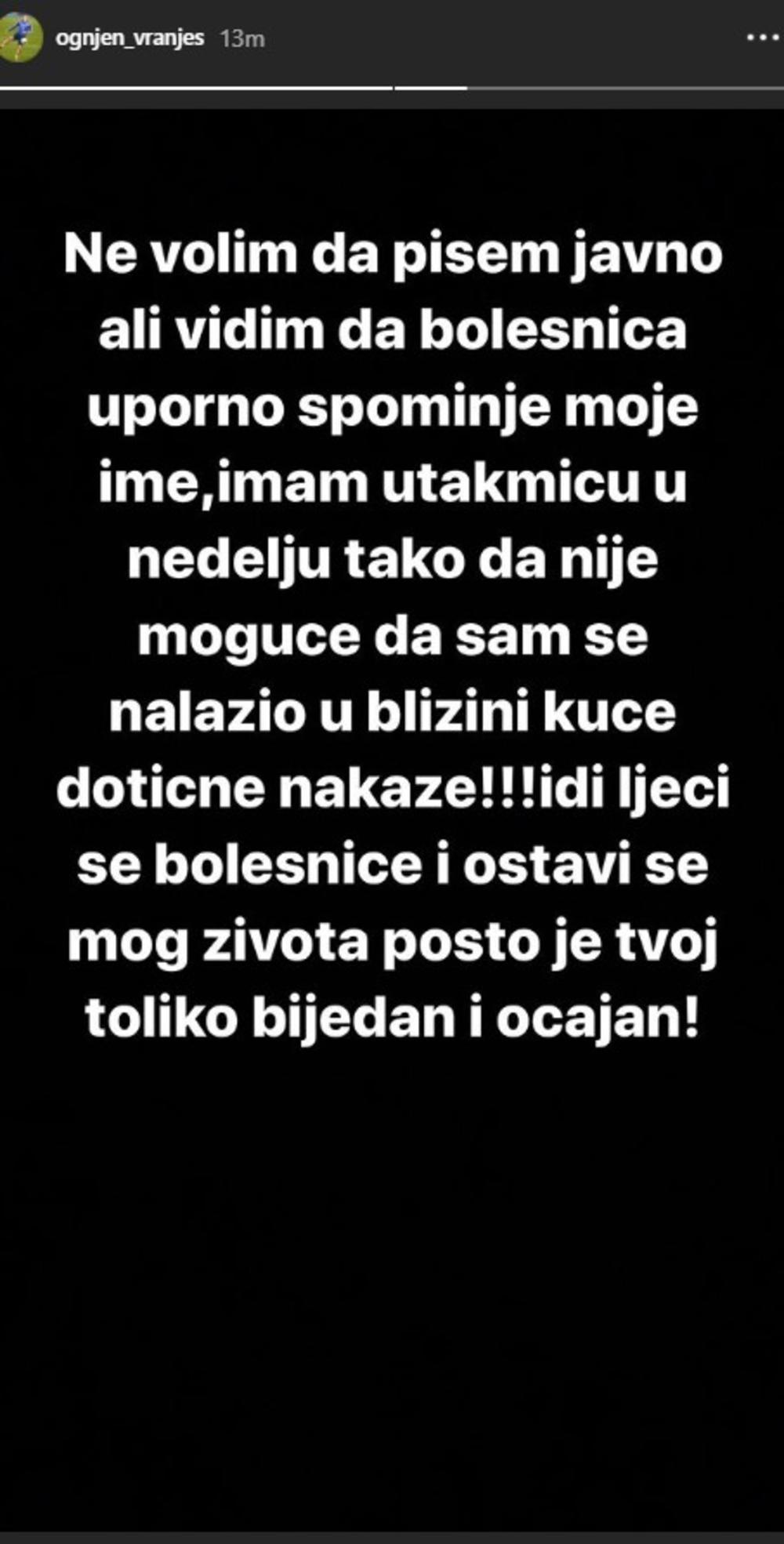 "Ne volim da pišem javno, ali vidim da bolesnica uporno spominje moje ime, imam utakmicu u nedelju, tako da nije moguće da sam se nalazio u blizini kuće dotične nakaze! Idi, leči se, bolesnice, i ostavi se moga života pošto je tvoj toliko bedan i očajan", odgovorio je fudbaler JK