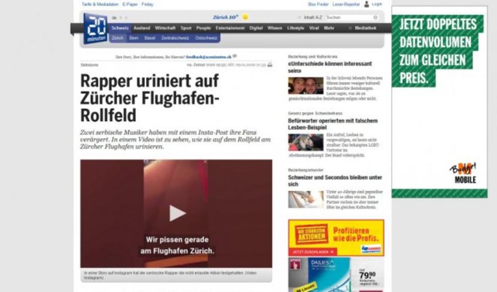 O reperu Slobodanu Veljkoviću Cobiju i njegovom sramnom ponašanju na aerodromu u Cirihu pisao je poznatiji švajcarski tabloid "20 minuten"