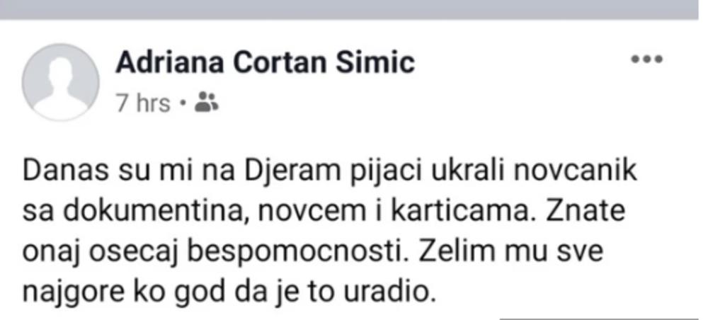 - Danas su mi na Đeram pijaci ukrali novčanik sa dokumentima, novcem i karticama. Znate onaj osećaj bespomoćnosti. Želim mu sve najgore ko god da je to uradio - napisala je voditeljka na Fejsbuku.