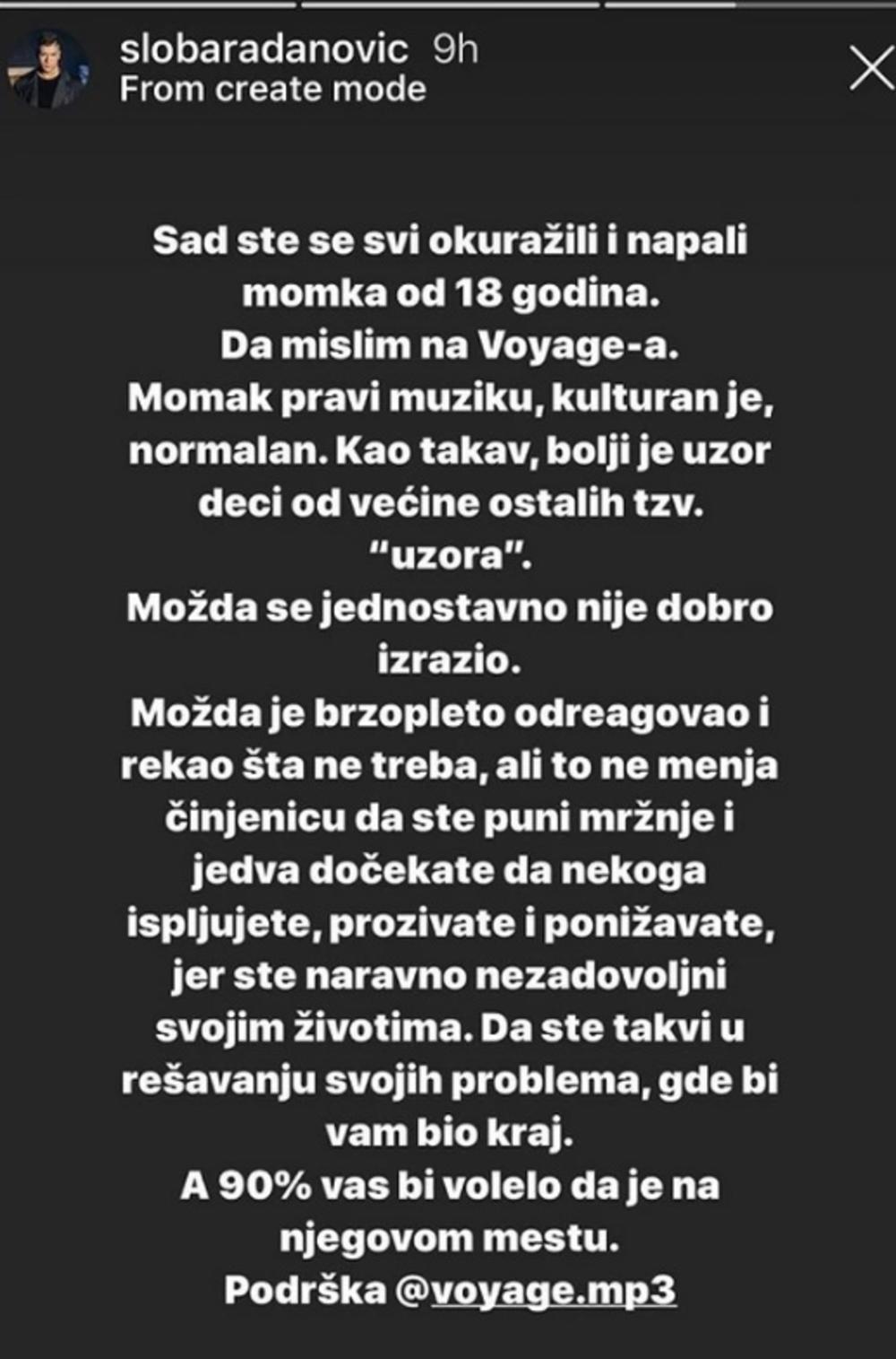 - Sad ste se svi okuražili i napali momka od 18 godina. Da, mislim na Voyage-a. Momak pravi muziku, kulturan je, normalan. Kao takav, bolji je uzor deci od većine ostalih tzv. "uzora". Možda se jednostavno nije dobro izrazio. Možda je brzopleto odreagovao i rekao šta ne treba, ali to ne menja činjenicu da ste puni mržnje i jedva dočekate da nekoga ispljujete, prozivate i ponižavate, jer ste naravno nezadovoljni svojim životima - napisao je pevač.