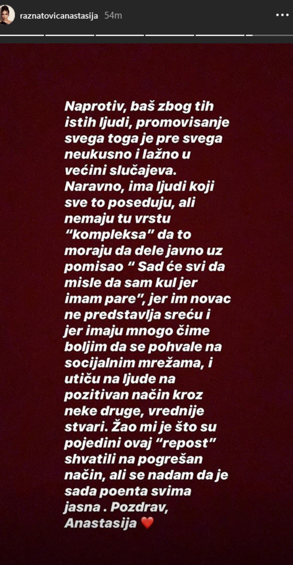 Anastasija je dodala - Baš zbog tih istih ljudi, promovisanje svega toga je pre svega neukusno i lažno u većini slučajeva. Naravno, ima ljudi koji sve to poseduju, ali nemaju tu vrstu "kompleksa" da to moraju da dele javno uz pomisao "Sad će svi da misle da sam kul jer imam pare", jer im novac ne predstavlja sreću i jer imaju mnogo čime boljim da se pohvale na socijalnim mrežama, i utiču na ljude na pozitivan način, kroz neke druge, vrednije stvari. Žao mi je što su pojedini ovaj "repost" shvatili na pogrešan način, ali se nadam da je sada poenta svima jasna. Pozdrav - napisala je pevačica.