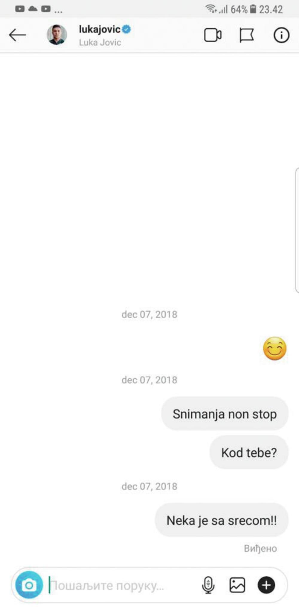 - Luki se Jovana baš svidela. On inače voli plavuše i uglavnom njih i startuje. Tada kada je želeo da se upozna sa Jovanom, nije bio naročito poznat, niti prisutan u javnosti kao danas. Prati on većinu pevačica, starleta i javnih ličnosti, ali, eto, Jovana mu je zapala za oko. Nije želeo da bude navalentan, nego je samo prokomentarisao da je zgodna jer je postavila atraktivnu fotografiju. I ona sigurno nije bila imuna na njega čim mu je odgovorila. Kratko su se dopisivali jer je videla da je reč o fudbaleru koji je dosta mlađi od nje, pa je bila štura i obazriva u odgovorima. Nisu razmenili brojeve telefona, niti su se udubljivali u komunikaciju i sve se završilo na nekoliko kratkih slatkorečivih komentara na račun njenog izgleda - završava naš sagovornik.