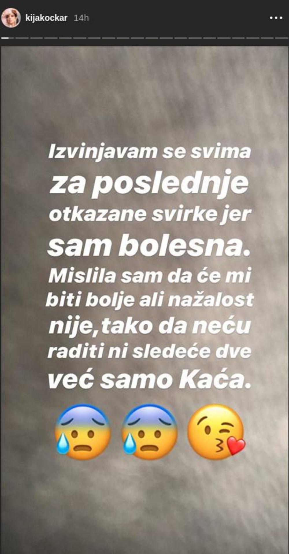 - Izvinjavam se svima za poslednje otkazane svirke jer sam bolesna. Mislila sam da će mi biti bolje, ali nažalost nije, tako da neću raditi ni sledeće dve već samo Kaća - poručila je Kockareva, aludirajući na koleginicu Katarinu Živković koja nastupa sa njom.