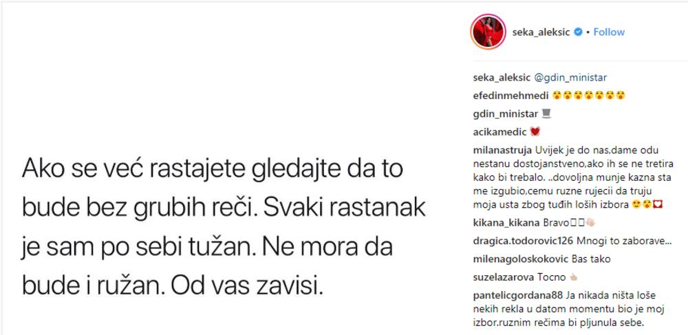 - Ako se već rastajete, gledajte da to bude bez grubih reči. Svaki rastanak je sam po sebi tužan. Ne mora da bude i ružan. Dd vas zavisi - napisala je Seka, dok su njeni pratioci sa odobravanjem podržali njene reči.