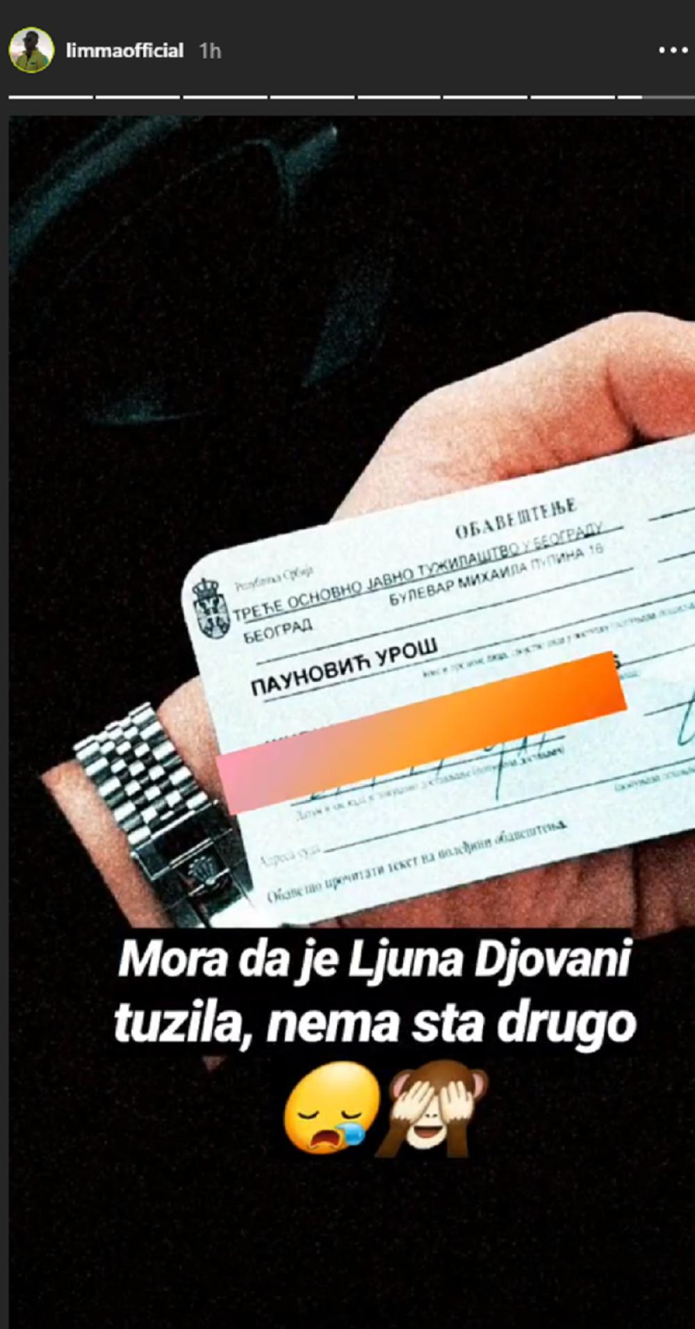 Odmah potom Lima je objavio i uručen sudski potiv, gde je napisao da je to od Ljune Djovani jasno aludirajući na pobednicu "Zadruge".