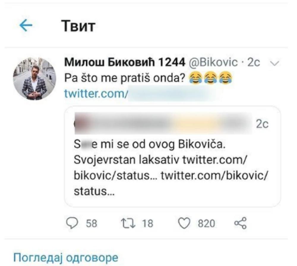 - Pa što me pratiš onda? - napisao je Miloš, uz emotikone koji "plaču" od smeha.