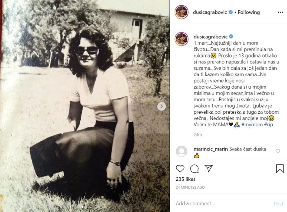 - 1.mart...Najtužniji dan u mom životu...Dan kada si mi preminula na rukama? Proslo je 13 godina otkako si nas prerano napustila i ostavila nas u suzama...Sve bih dala za još jedan dan da ti kazem koliko sam sama...Ne postoji vreme koje nosi zaborav...Svakog dana si u mojim mislima,u mojim secanjima i večno u mom srcu...Postojiš u svakoj suzi,u svakom trenu mog života...Ljubav je prevelika,bol preteska,a tuga za tobom večna...Nedostajes mi andjele moj? Volim te MAMA❤ - napisala je pevačica.