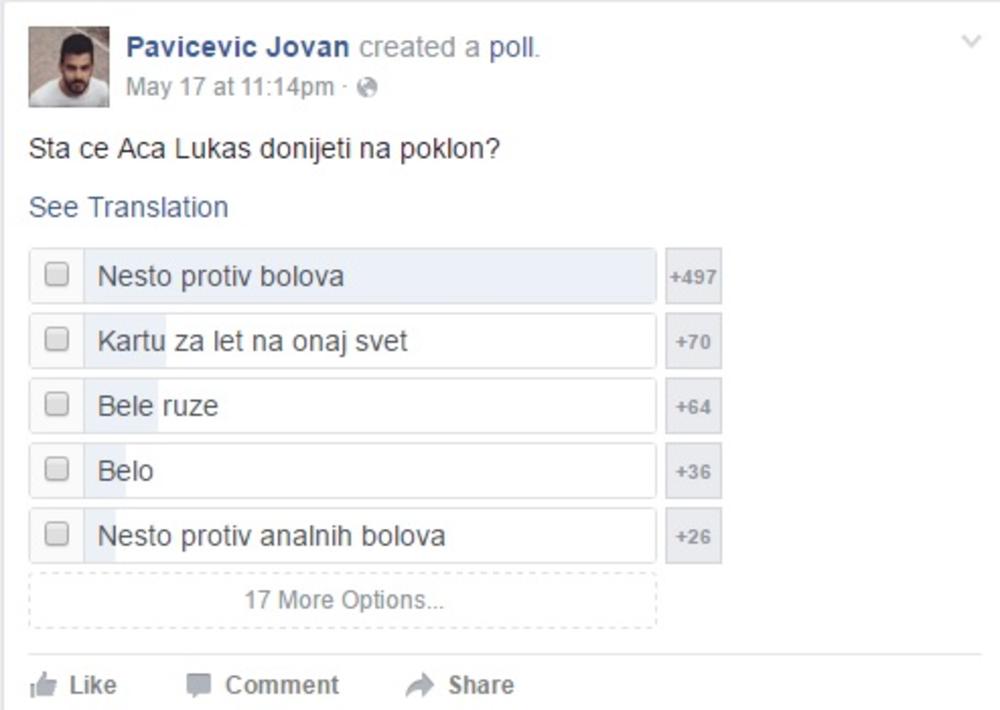 Cecinaezimica će za koji dan napuniti 18 godinarođendanuFejsbukuu kojoj se maštoviti ljudi sprdaju sa ovom temom. A šta tamo rade migranti, Čeda, Betmen, Vučić... 15 najkomičnijih prozivki za Anastasijin rođ!Anastasijaizgledati i ko će joj na rođendanu pevati, ali i o tome šta će Cecina mezimica dobiti na poklon. Bubreg, papričice, srednji prst, zadnje parče hleba: Šta duhoviti Srbi poklanjaju Cecinoj ćerki za 18. rođ!da svaka kuća mora imati ikonu.foto: Printscreen/ Facebook/ Kupovina poklona za Anastasijino punoletstvoPokon spreman i upakovan!foto: Printscreen/ Facebook/ Kupovina poklona za Anastasijino punoletstvoali su poslali snažnu poruku. foto: Printscreen/ Facebook/ Kupovina poklona za Anastasijino punoletstvoVažan je znak pažnje.foto: Printscreen/ Facebook/ Kupovina poklona za Anastasijino punoletstvopa poklanjaju sve što imaju. foto: Printscreen/ Facebook/ Kupovina poklona za Anastasijino punoletstvočokolada je nezaobilazan dar za svaki rođendan.