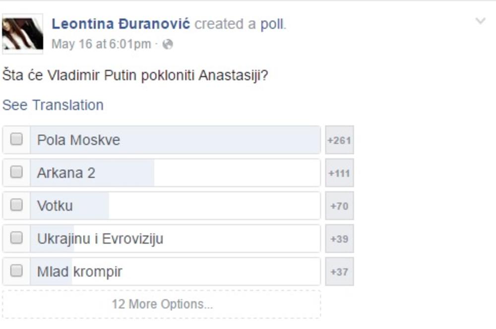 foto: Printscreen/ Facebook/ Kupovina poklona za Anastasijino punoletstvo pare su uvek dobar poklon!foto: Printscreen/ Facebook/ Kupovina poklona za Anastasijino punoletstvodobiti i polovnu kosačicu i nove čizme.foto: Printscreen/ Facebook/ Kupovina poklona za Anastasijino punoletstvoDarovi stižu čak i iz Ljubljane. foto: Printscreen/ Facebook/ Kupovina poklona za Anastasijino punoletstvoAca LukasBolje ovo nego čašu olova!foto: Printscreen/ Facebook/ Kupovina poklona za Anastasijino punoletstvo devojke vole da dobiju dobar i kvalitetan parfem. foto: Printscreen/ Facebook/ Kupovina poklona za Anastasijino punoletstvoVladimir Putinmoraće i on da joj donese poklon. foto: Printscreen/ Facebook/ Kupovina poklona za Anastasijino punoletstvo