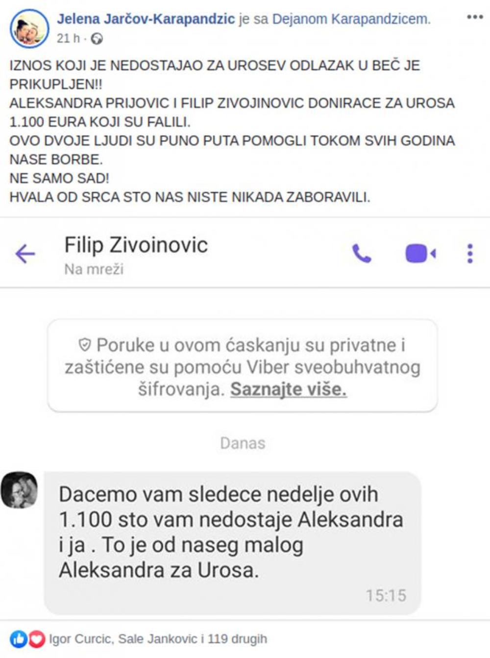 - Iznos koji je nedostajao za Urošev odlazak u Beč je prikupljen! Aleksandra Prijović i Filip Živojinović doniraće za Uroša 1 100 evra koji su falili. Ovo dvoje ljudi su puno puta pomogli tokom naše borbe, ne samo sad! Hvala vam od srca, što nas nikada niste zaboravili - piše u objavi.