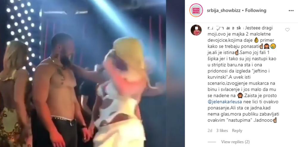 - Jeste dragi moji, ovo je majka 2 maloletne devojčice,kojima daje ? primer kako se trebaju ponašati ☝??. ? je, ali je istina☝?. Samo joj fali 1 šipka jer i tako su joj nastupi kao u striptiz baru, na šta i ona pridonosi da izgleda "jeftino i k*rvinski". A uvek isti scenario ,izvođenje muškarca na binu i svlačenje i još malo da mu se nadene na ?. Zaista je prosto Jelena, ne liči ti ovakvo ponašanje. Ali šta ce jadna ,kad nema glas, mora publiku zabavljati ovakvim "nastupima". Jadno - napisala je jedna anti obožavateljka.