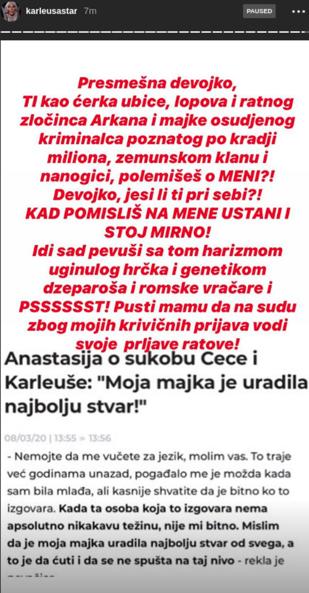 Iako se do sada nije mešala u sve to, Cecina ćerka Anastasija je nedavno izjavila kako je njena majka uradila najbolju stvar time što se "ne spušta na Karleušin nivo".