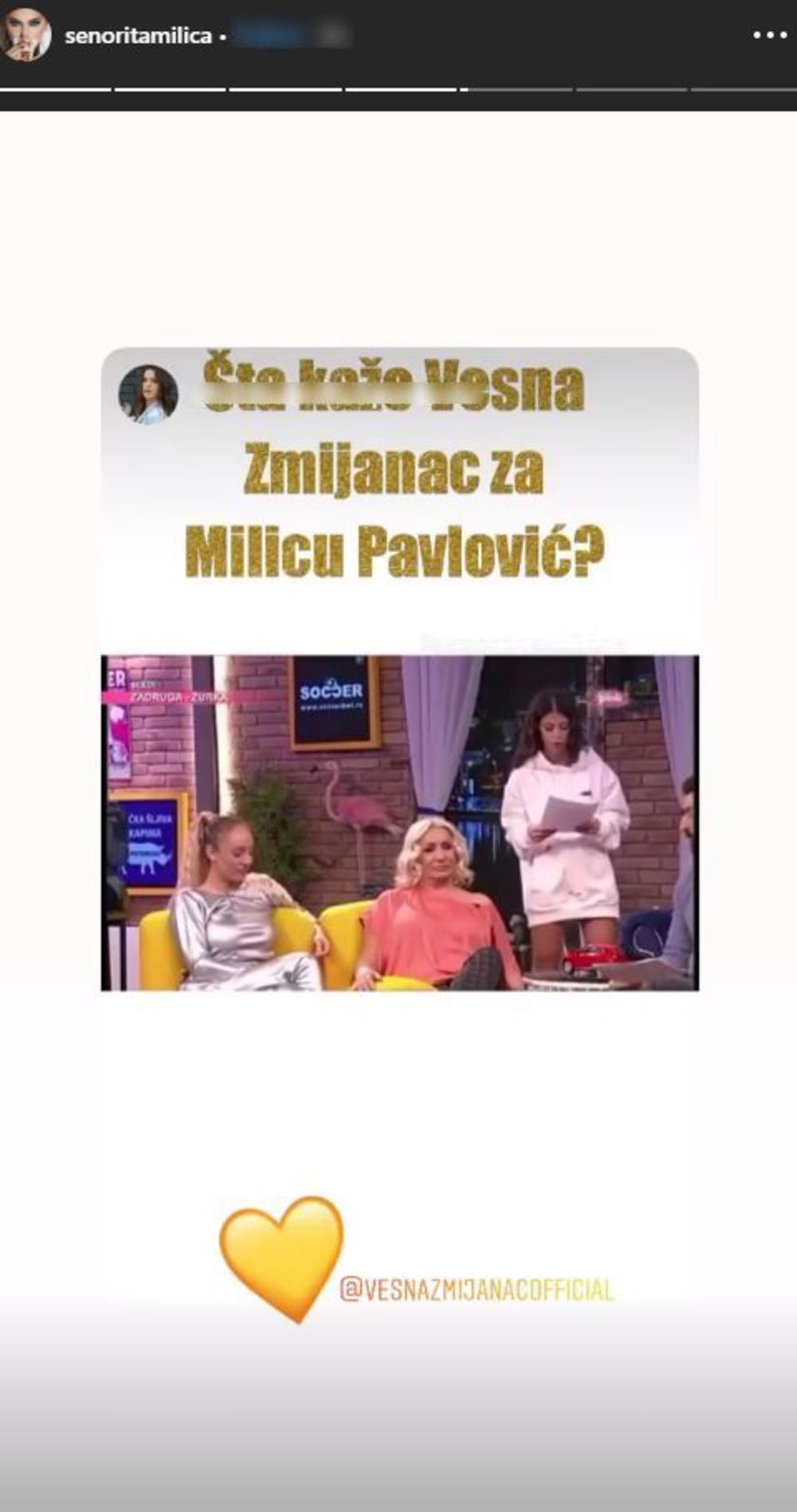 Zapravo, mlađa pevačica na svom Instagram profilu podelila je ovu Vesninu izjavu bez dela gde Zmijančeva govori o Miličinom pevanju.