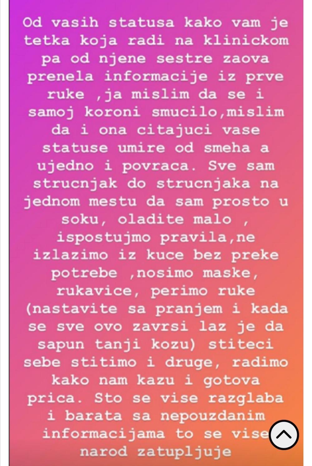 "Od vaših statusa kako vam je tetka koja radi na kliničkom pa od njene sestre zaova prenela informacije iz prve ruke, ja mislim da se i samoj koroni smučilo, mislim da i ona čitajući vaše statuse umire od smeha a ujedno i povraća. Sve sam stručnjak do stručnjaka na jednom mestu d sam prosto u šoku, oladite malo, ispoštujmo pravila, ne izlazimo iz kuće bez preke potrebe, nosimo maske, rukacice, perimo ruke (nastavite sa pranjemi kada se sve ovo završi, laž je da sapun tanji kožu) štiteći sebe štitimo i druge, radimo kako nam kažu i gotova priča. Što se više razglaba i barata sa nepouzdanim informacijama to se više narod zatupljuje." - napisala je pevačica.