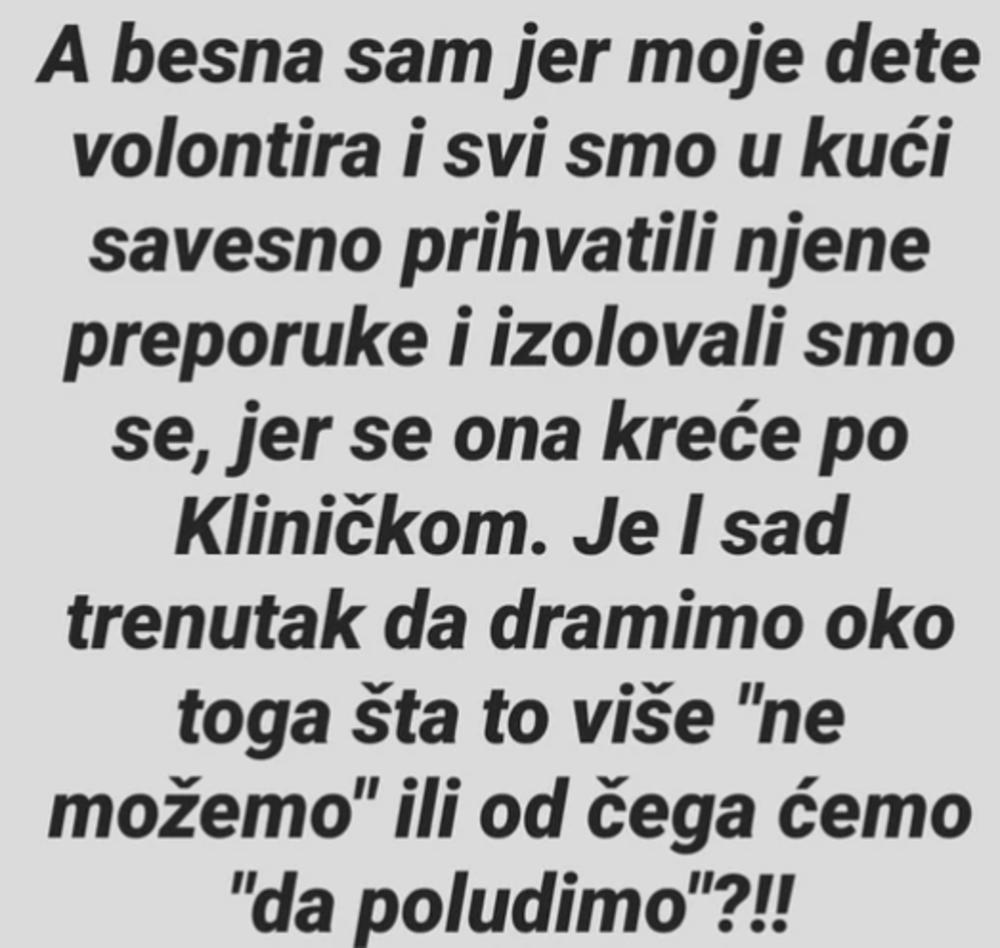 - A besna sam jer moje dete volontira i svi smo u kući savesno prihvatili njene preporuke i izolovali smo se, jer se ona kreće po kliničkom - poručila je voditeljka "Slagalice", a onda dodala: