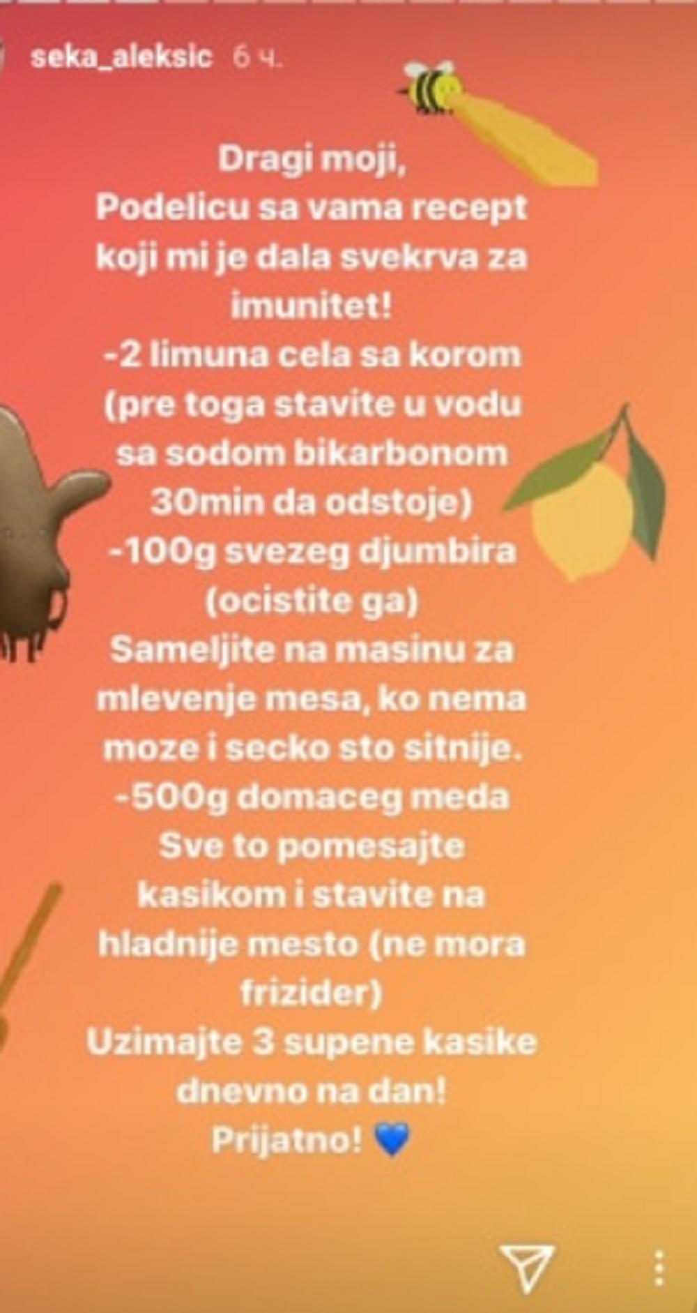 SEKA ALEKSIĆ VERUJE U OVAJ RECEPT, PRAVO IZ SVEKRVINE KUHINJE: Najefikasniji lek da izbegnete koronavirus! (FOTO)