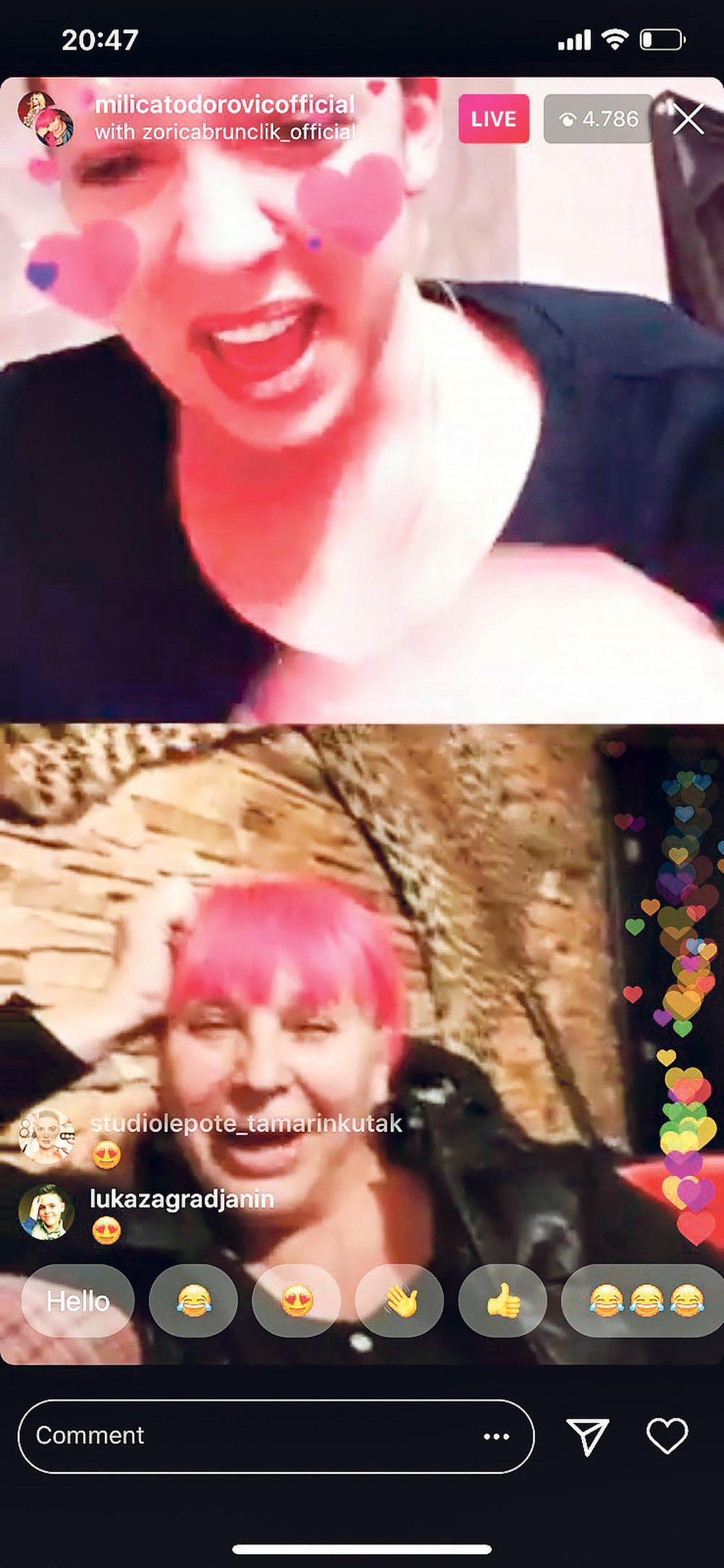 U međuvremenu, u njen lajv uključio se i Goran Čomor, i to iz kupatila. Voditelj se opuštao u kadi, a kada je shvatio da ga vide pevačicini pratioci, brzo je prekinuo poziv. Milica se zacenila od smeha. - Čomor mi se javio iz kade, ja ne verujem - rekla je ona brišući suze s lica.
