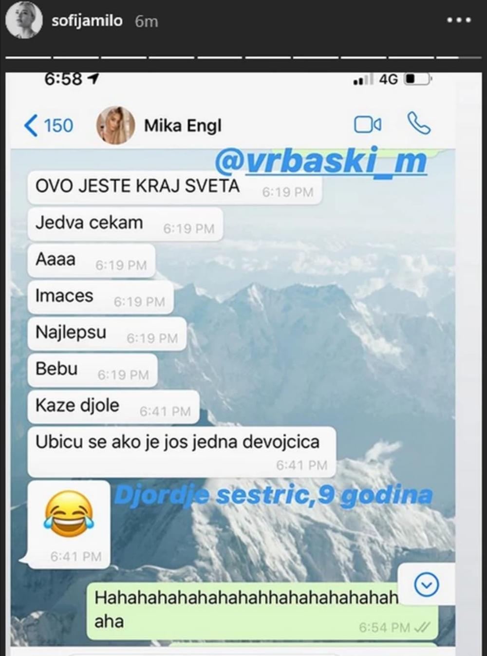 - Ovo jeste kraj sveta. Jedva čekam. Imaćeš najlepšu bebu kaže Đole. Ubiću se ako je još jedna devojčica - glasi poruka koju je Sofija primila, manekenka je otkrila da je Đole zapravo njen sestrić Đorđe koji ima devet godina