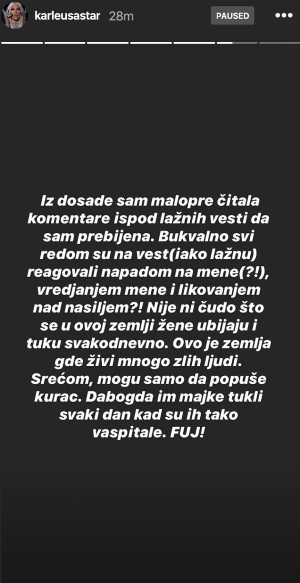 - Iz dosade sam malopre čitala komentare ispod lažnih vesti da sam prebijena. Bukvalno svi redom su na vest (iako lažnu) reagovali napadom na mene(?!), vređanjem mene i likovanjem nad nasiljem?! Nije ni čudo što se u ovoj zemlji žene ubijaju i tuku svakodnevno. Ovo je zemlja gde živi mnogo zlih ljudi. Srećom, mogu samo da po*uše ku*ac. Dabogda im majke tukli svaki dan, kad su ih tako vaspitale. FUJ - napisala je Karleuša.