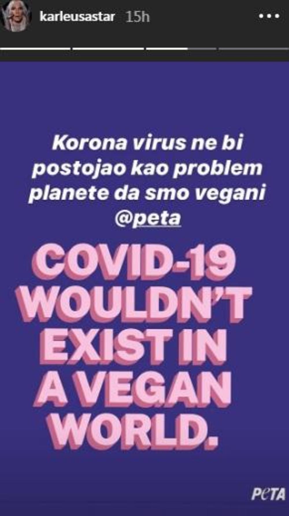 - Korona virus ne bi postojao kao problem planete da smo svi vegani - podržala je Karleuša stav organizacije PETA.