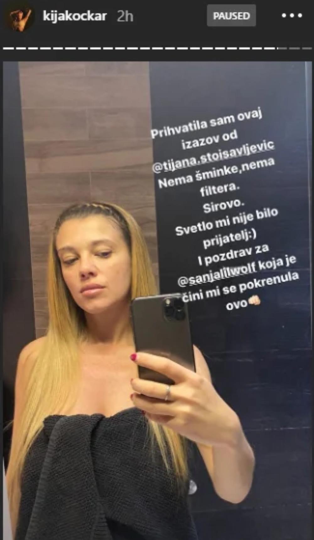 - Prihvatila sam ovaj izazov od Tijane Stoisavljević. Nema šminke, nema filtera. Sirovo... Svetlo mi nije prijatelj. I pozdrav za Sanju Vučić koja je, čini mi se, pokrenula sve ovo - napisala je Kija.