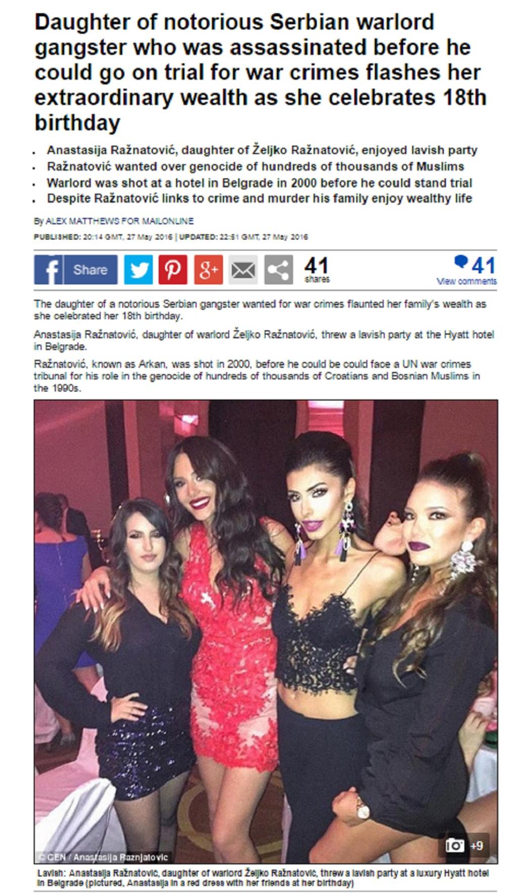 Britanski “Dejli mejl“ objavio je vest o slavlju 18. rođendana Cecine ćerke Anastasije, ali se više osvrnuo na to ko joj je otac.Zbog ovoga je Anastasija bila najsrećnija na žurci: Kostadin joj je prišao, uhvatio je za ruku, a onda... (VIDEO)foto: Instagram/raznatovic_anastasija "čuvenog srpskog gangstera traženog zbog ratnih zločina“ pokazala svo svoje porodično bogatstvo na proslavi punoletstva.foto: Dragan KadićArkanovog života nazvavši njegova dela "brutalnim“, te zaključili da se pored svega toga njegova ćerka ipak "dovezla limuzinom ispred Hajata noseći divnu crvenu toaletu".foto: Printscreen/Daily Mailrazmetanja porodice Ražnatović, pa su tako i preneli neke od komentara koji su se pojavili na internetu.foto: instagram/raznatovicanastasijaosim što su spomenuli da je folk pevačica.