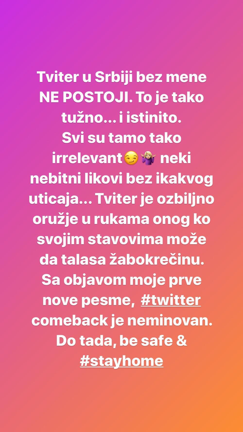 - Tviter bez mene u Srbiji ne postoji, to je tako tužno i istinito. svi su tamo neki nebitni likovi bez ikakvog uticaja. Tviter je ozbiljno oružje u rukama onog ko svojim stavovima može da talasa žabokrečinu. sa objavom moje prve nove pesme, povratak na Tviter je neminovan. Do tada budite sigurni i ostanite kod kuće - poručila je Jelena.