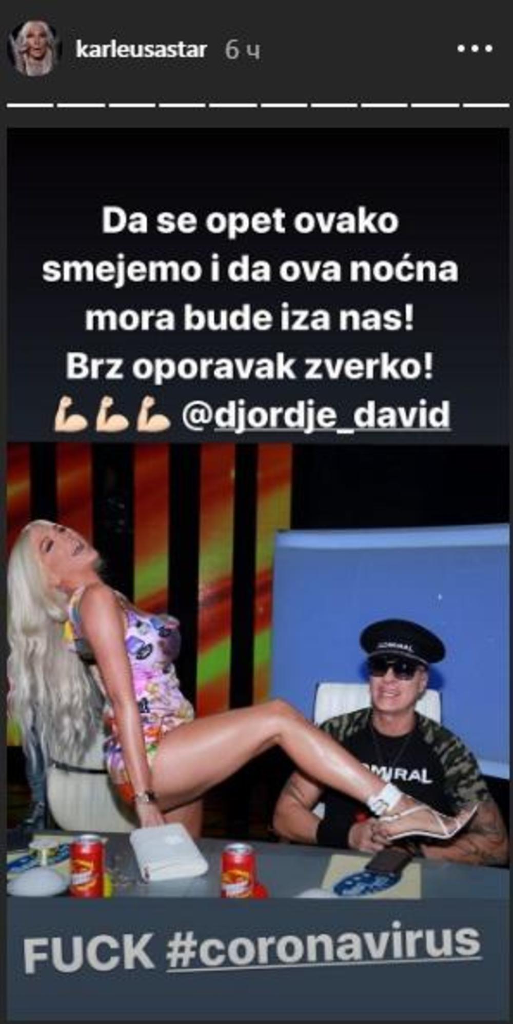 - Da se opet ovako smejemo i da ova noćna mora bude iza nas! Brz oporavak, zverko. Neka se j*be korona virus - napisala je Karleuša.