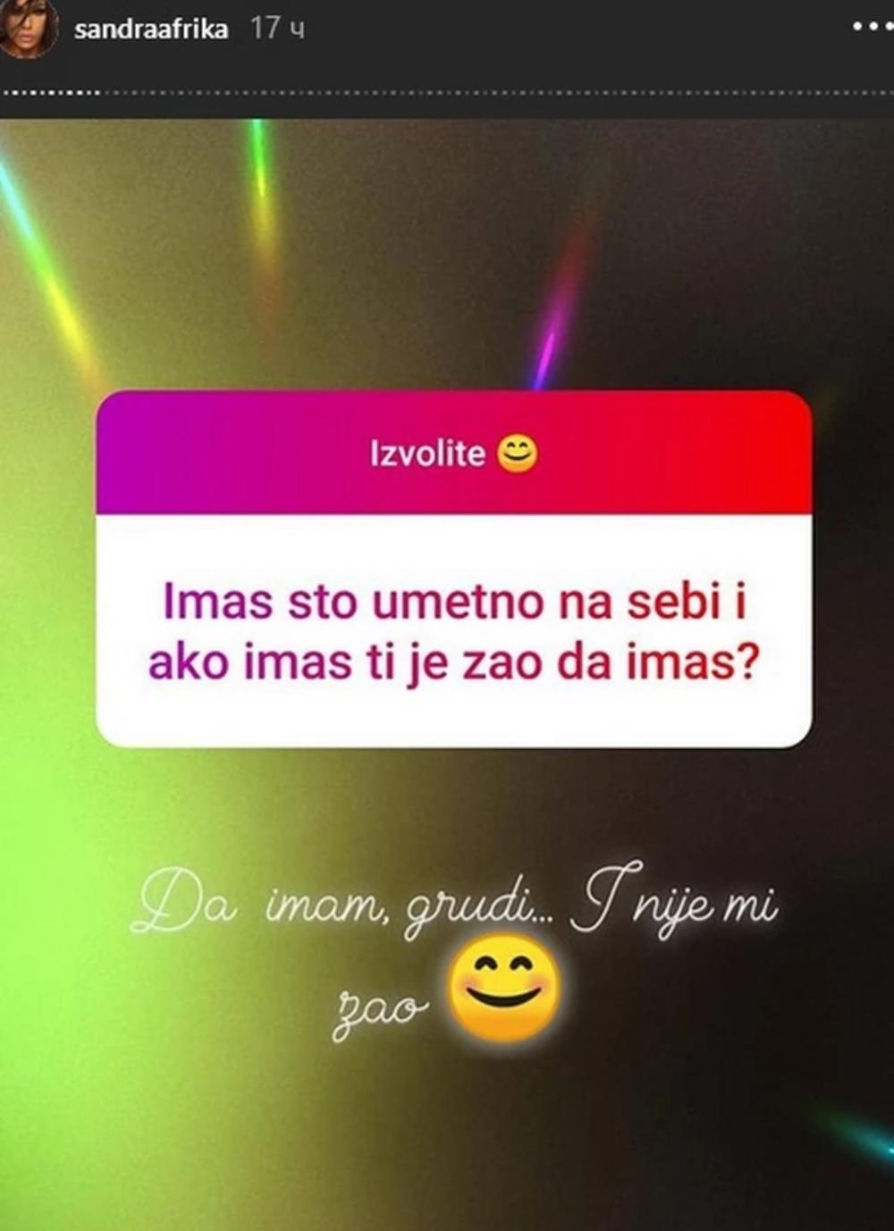 Jedno od pitanja bilo je i da li ima nešto veštačko na svom telu i da li joj je žao zbog toga.