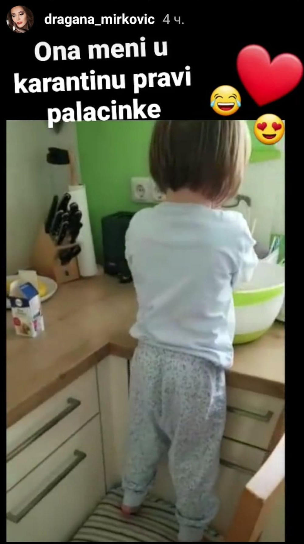 Na njoj se vidi devojčica od 3-4 godine kako muti palačinke, a u trenutku kada je mama pita kome pravi kolačem, ona bez razmišljanja odgovara Dragani Mirković.