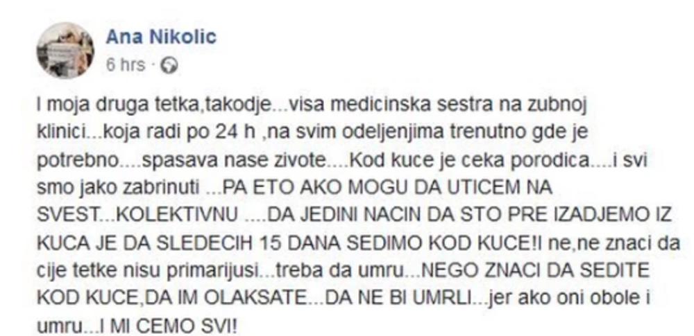 - Moja druga tetka... Viša medicinska sestra na zubnoj klinici... Koja radi po 24h, na svim odeljenjima trenutno gde je potrebno... Spasava naše živote... Kod kuće je čeka porodica... I svi smo jako zabrinuti... - započela je Ana obraćanje javnosti, pa nastavila: