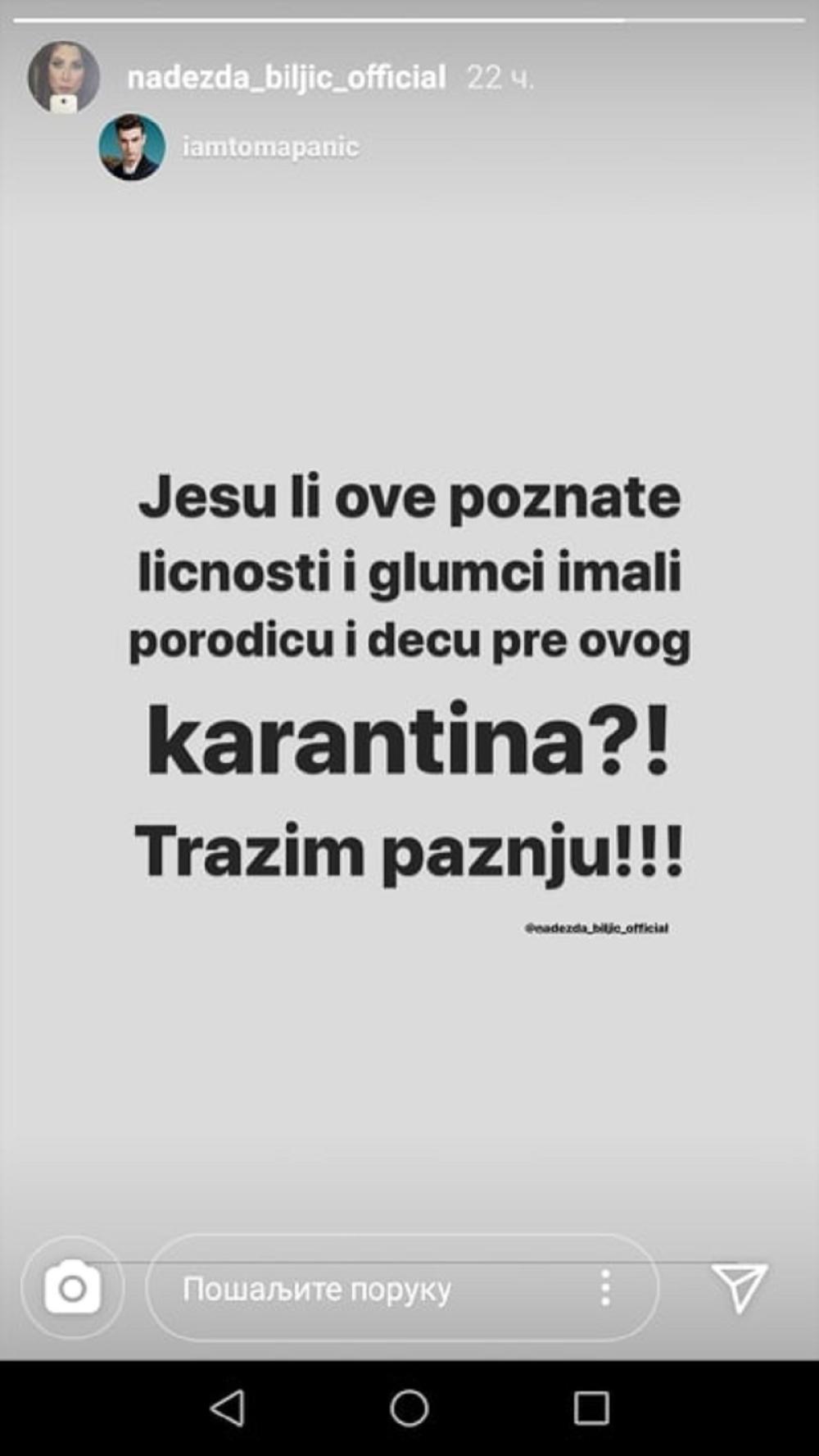 - Jesu li ove poznate ličnosti i glumci imali porodicu i decu pre ovog karantina? Tražim pažnju!!! - napisala je Biljićka.