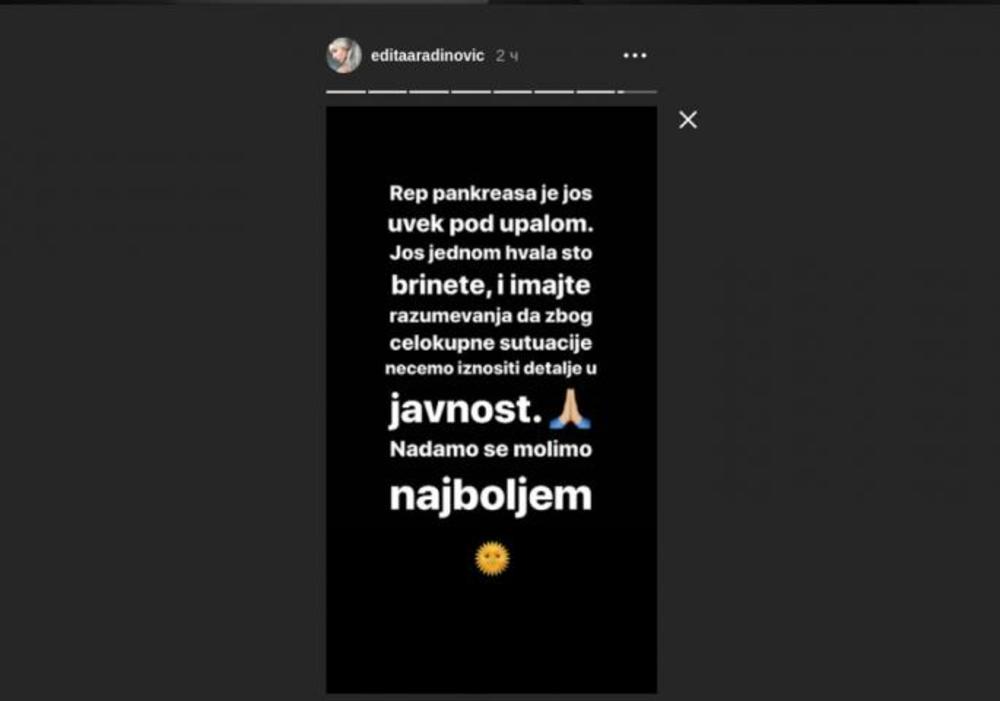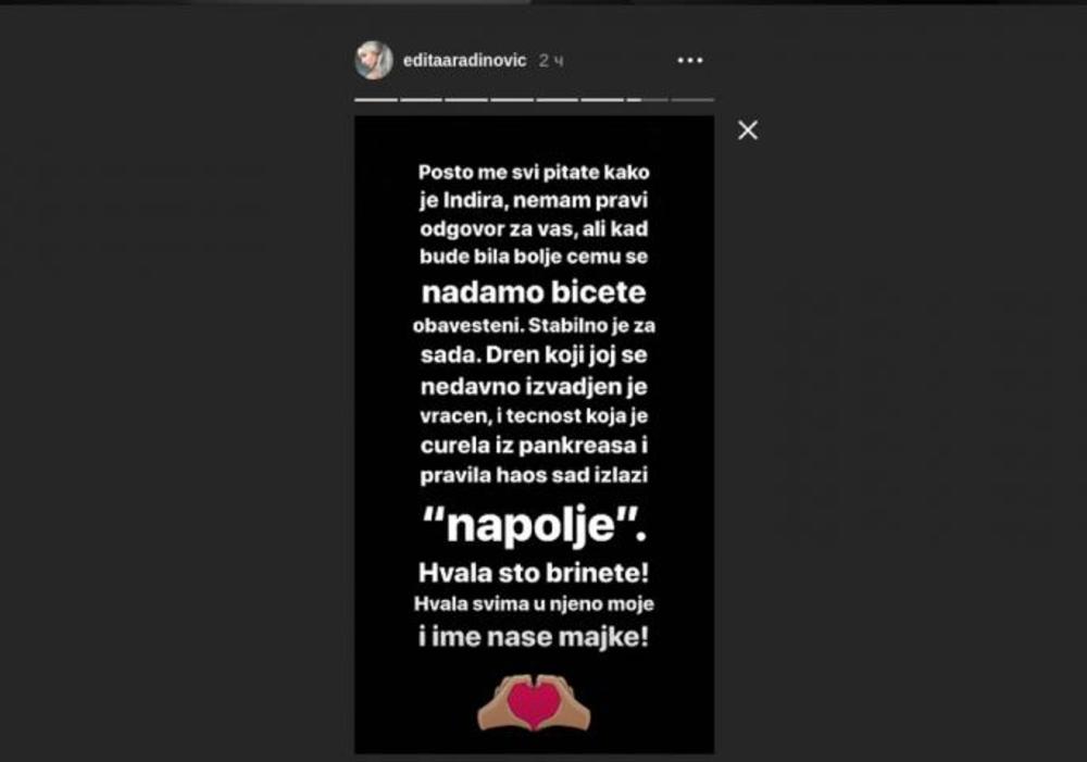 - Pošto me svi pitate kako je Indira, nemam pravi odgovor za vas, ali kad bude bila bolje, čemu se nadamo, bićete obavešteni. Stabilno je za sada. Dren koji joj je nedavno izvađen je vraćen i tečnost koja je curela iz pankreasa i pravila haos, sad izlazi "napolje". Hvala što brinete u njeno ime, moje i u ime naše majke - napisala je Edita, a potom pojasnila: