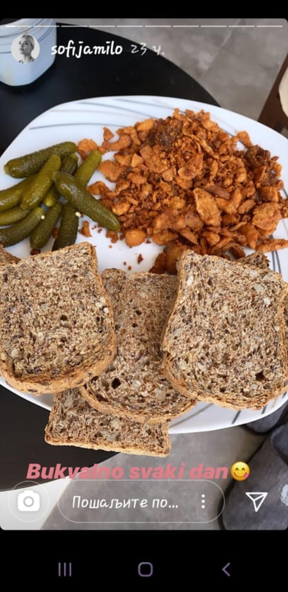 - Bukvalno svaki dan - napisala je Miloševićeva u opisu fotografije na kojoj se nalazi čvarci, krastavčići i hleb.