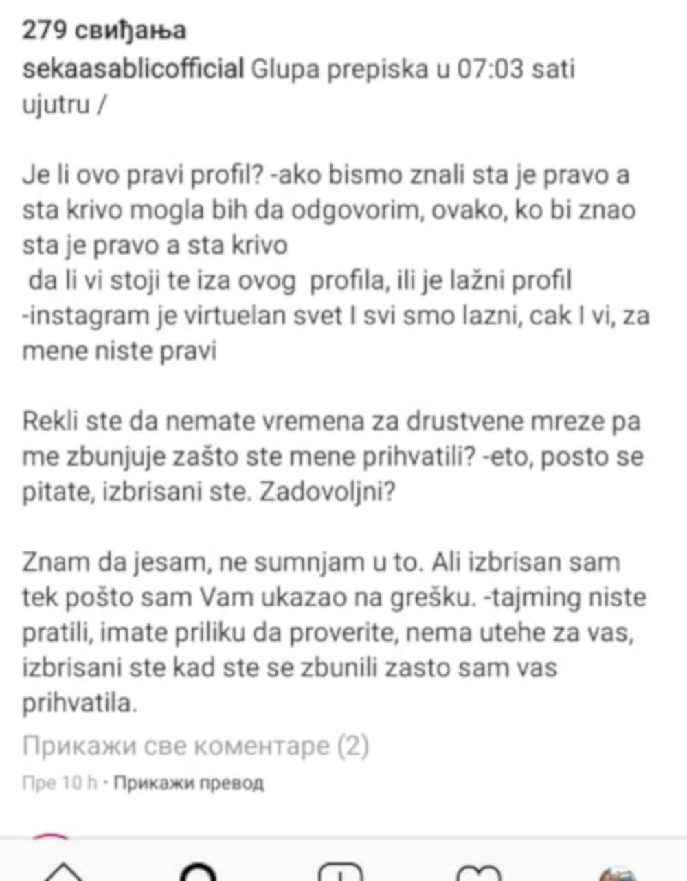 -Tajming niste pratili, imali ste priliku da proverite, nema utehe za vas, izbrisani ste kada ste se zbunili što sam vas prihvatila - odgovorila je Seka.
