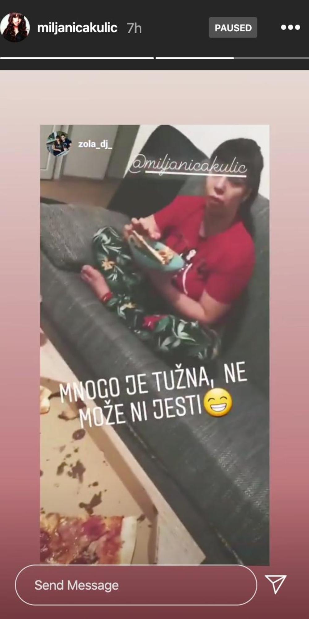 - Mnogo je tužna, ne može ni jesti - napisao je Zola uz snimak Miljane kako jede picu.