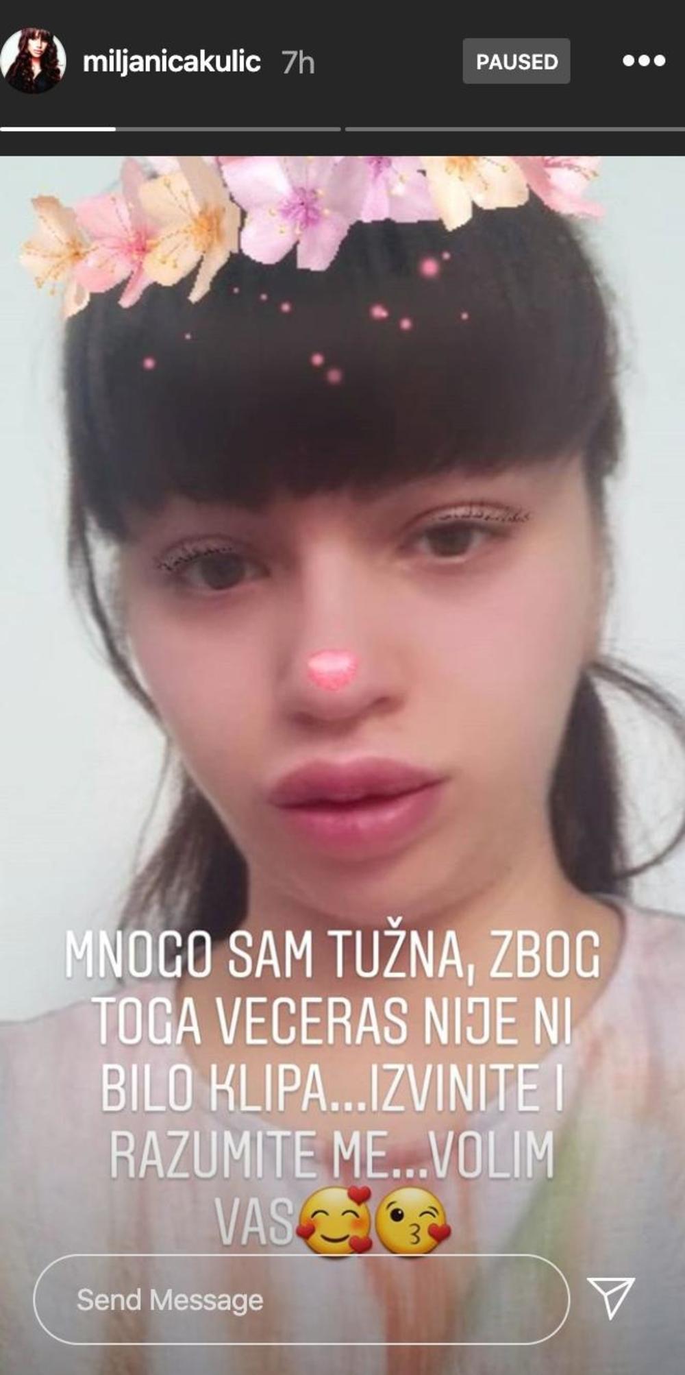 - Mnogo sam tužna, zato večeras nije ni bilo klipa. Izvinite i razumite me. Volim vas - napisala je Miljana, a potom podelila objavu svog dečka Lazara Čolića Zole, koji se našalio na njen račun: