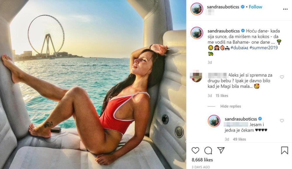Ona je na svom Instagram profilu objavila fotografiju od letos na kojoj pozira u kupaćem kostimu. Aleksandra se prisetila uživanja, a njeni pratioci odmah su je pitali kako se oseća u trudnoći.