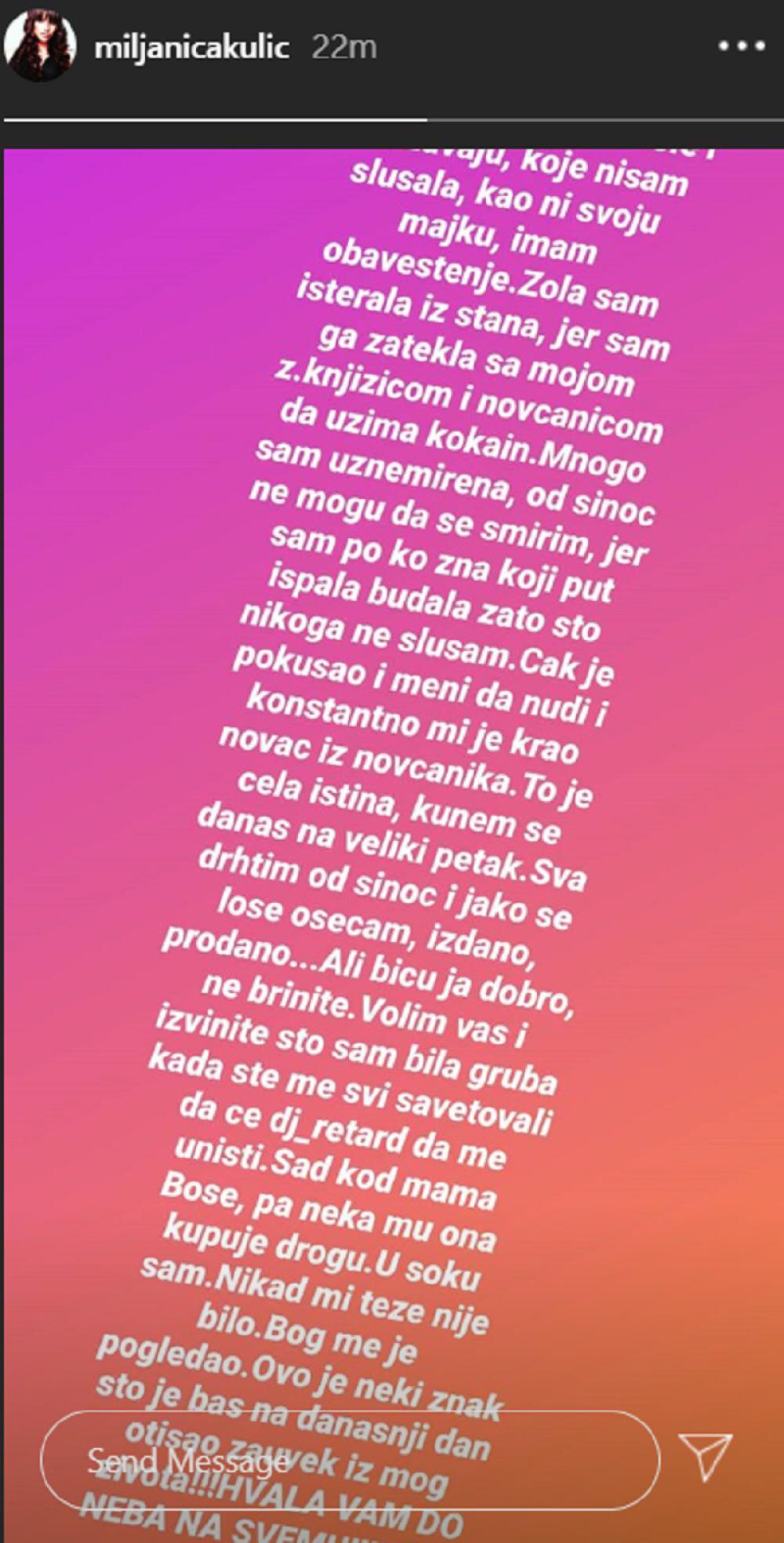 - Imam obaveštenje. Zolu sam isterala iz stana, jer sam ga zatekla sa mojom zdravstvenom knjižicom i novčanicom kako uzima kokain. Mnogo sam uznemirena, od sinoć ne mogu da se smirim, jer sam po ko zna koji put ispala budala zato što nikoga ne slušam. Čak je pokušao i meni da nudi, konstantno krao mi je novac iz novčanika. Kunem se, to je cela istina, a danas je Veliki petak. Sva drhtim od sinoć i jako se loše osećam, prodano, izdano. Ali biću ja dobro ne brinite. Volim vas i izvinite što sam bila gruba kada ste me svi savetovali da će dj retard da me uništi. Sad kod mama Bose pa neka mu ona kupuje drogu. U Šoku sam, nikad mi teže nije bilo. Bog me pogledao. Ovo je neki znak što je baš na današnji dan otišao iz mog života. Hvala vam do neba na svemu - završila je Kulićka.