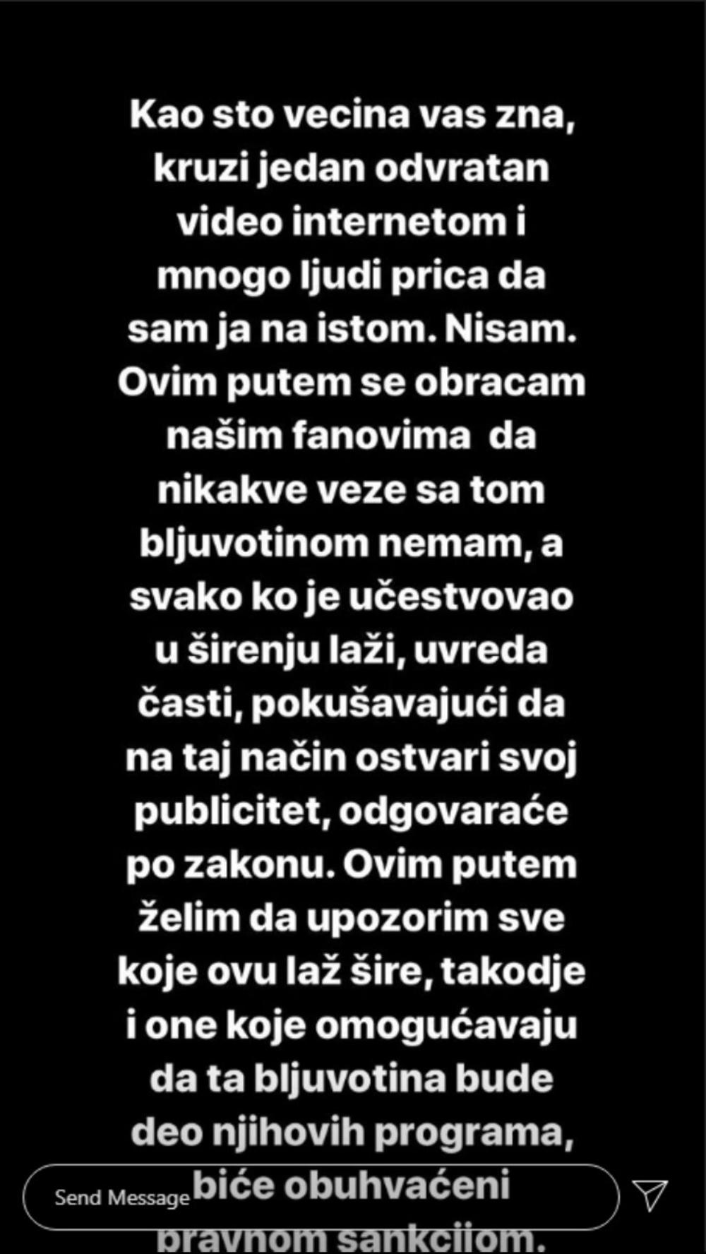 - Kao što većina vas zna, kruži jedan odvratan video internetom i mnogo ljudi priča da sam ja na istom. Nisam. Ovim putem se obraćam našim fanovima da nikakve veze sa tom bljuvotinom nemam, a svako ko je učestvovao u širenju laži, uvreda časti, pokušavajući da na taj način ostvari svoj publicitet, odgovaraće po zakonu - navela je Breskvica.