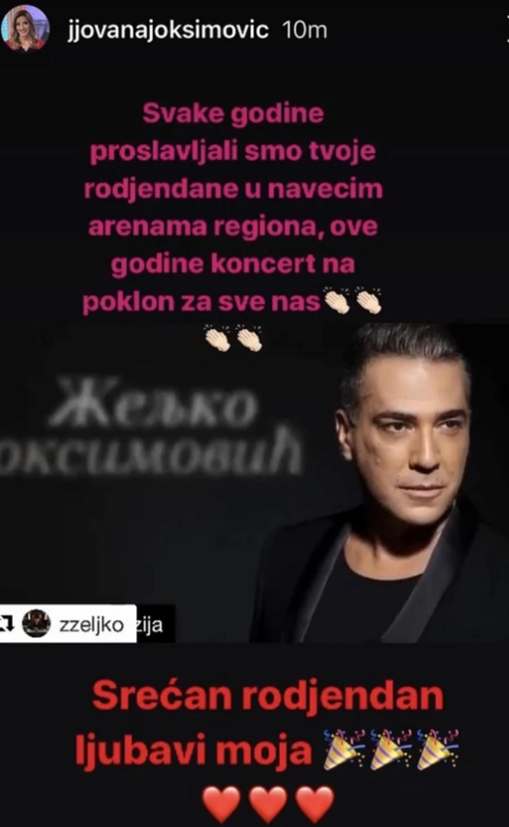 - Svake godine proslavljali smo tvoje rođendane u najvećim arenama regiona, ove godine koncert na poklon za sve nas. Srećan rođendan ljubavi moja - čestitala je Jovana emotivnim rečima...