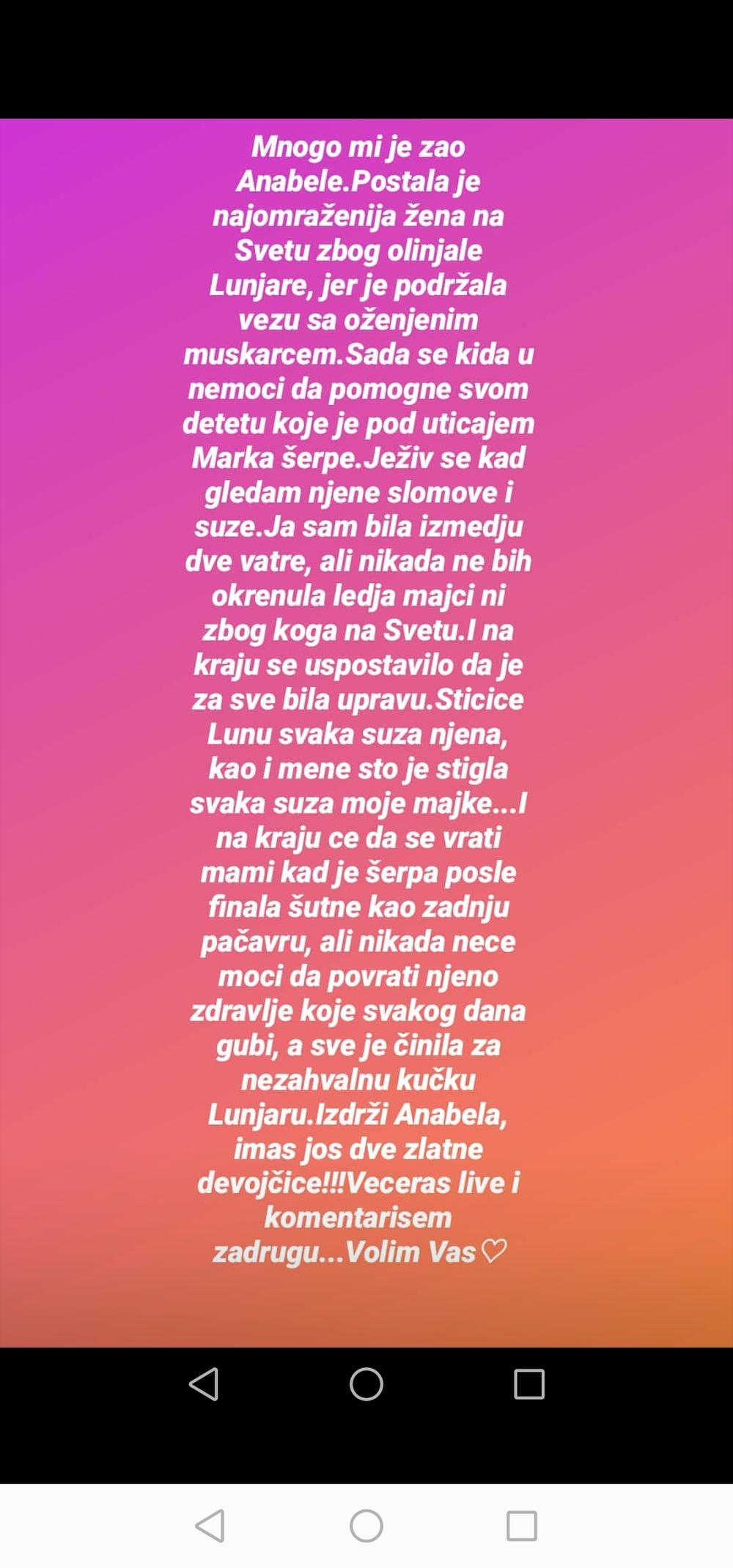 - Mnogo mi je žao Anabele. Postala je najomraženija žena na svetu zbog olinjale Lunjare, jer je podržala vezu sa oženjenim muškarcem. Sada se kida u nemoći da pomogne svom detetu koje je pod uticajem Marka šerpe. Ježim se kad gledam njene slomove i suze. Ja sam bila između dve vatre, ali nikada ne bih okrenula leđa majci ni zbog koga na svetu. I na kraju će da se vrati mami kad je šerpa posle finala šutne, ali nikada neće moći da povrati njeno zdravlje koje svakog dana gubi, a sve je činila za nezahvalnu Lunjaru. Izdrži Anabela, imaš još dve zlatne devojčice - napisala je Miljana koja je nedavno objavila i da je raskinula sa Zolom.