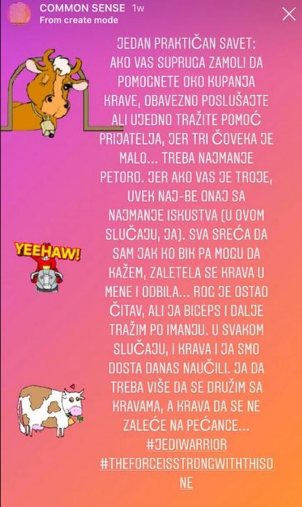 - Jedan praktičan savet, ako vas supruga zamoli da pomognete oko kupanja krave, obavezno poslušajte, ali ujedno tražite pomoć prijatelja, jer tri čoveka je malo... Treba najmanje petoro! Ako vas je troje, uvek na***e onaj sa najmanje iskustva, u ovom slučaju ja - započeo je on na svom Instagram profilu.