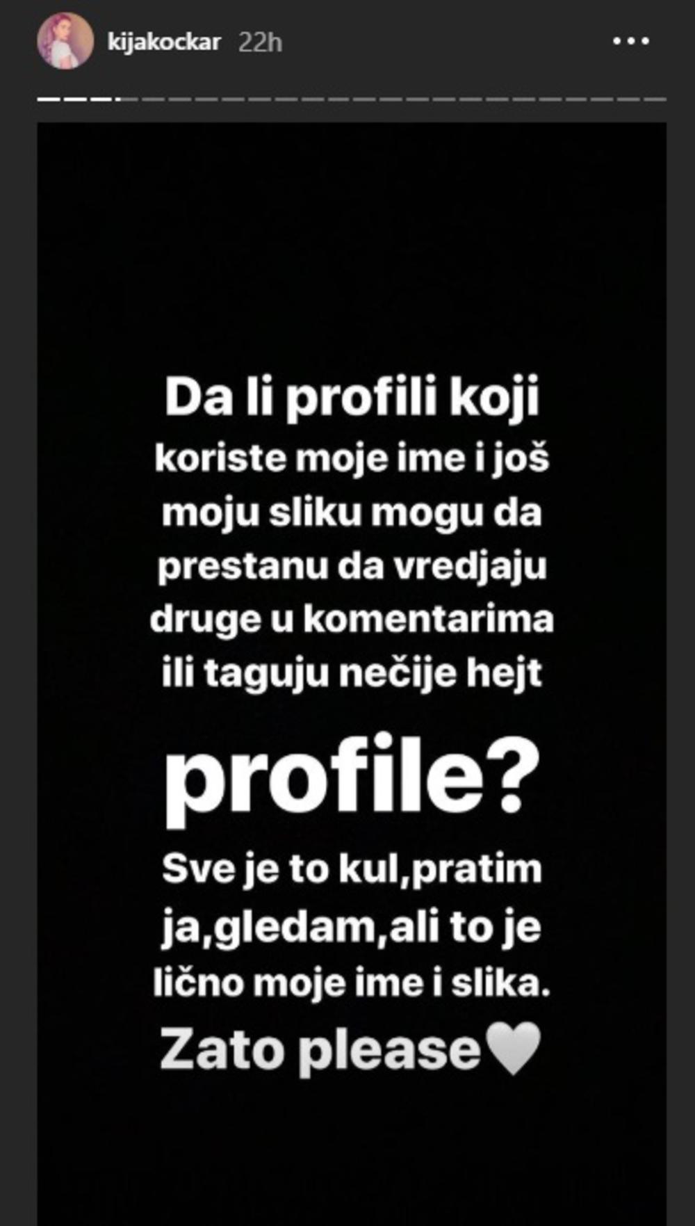 - Da li profili koji koriste moje ime i još moju sliku mogu da prestanu da vređaju druge u komentarima ili taguju nečije hejt profile? Sve je to kul, pratim ja, gledam, ali to je lično moje ime i slika. Zato, molim vas - javno je apelovala Kija.