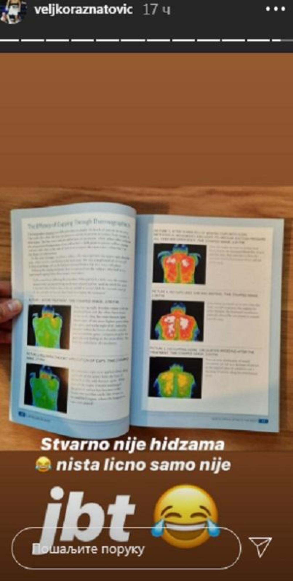 - Kod najboljeg - napisao je Veljko, i time pokrenuo lavinu komentara. Pojedini pratioci su bili zabrinuti za njegovo zdravlje, te je Ražnatović na kraju dao svima objašnjenje da je u pitanju tehnika masiranja čašama kojoj se podvrgao i koja se koristi u skopu tibetanske narodne medicine.